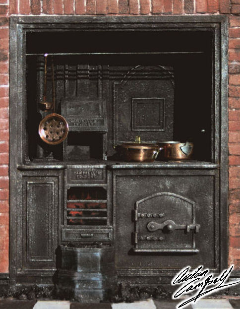 1/12th scale scratch build kitchen range with inbuilt flickering fire light effects. Size: 140mm wide
