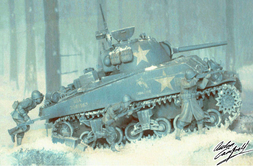 1/35th scale diorama depicting a scene from the Ardennes forest in WWII utilising a variety of scratch built and commercially mass produced kits. Size: area shown approx. 250mm square