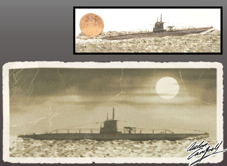 1/400th scale U-boat diorama based around a heavily modified plastic kit in a hand sculpted seascape. Size: hull approx. 90mm long