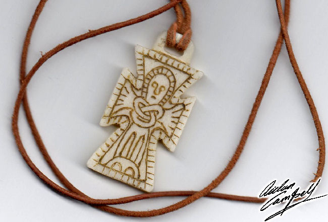 Crude hand carved cattle bone crucifix in a simple early medieval style. Size: 50mm tall.