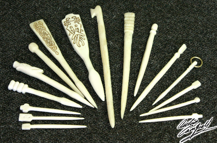 An assortment of different hand carved bone hair/clothes pins from different periods spanning Roman to medieval. Size: up to 150mm long