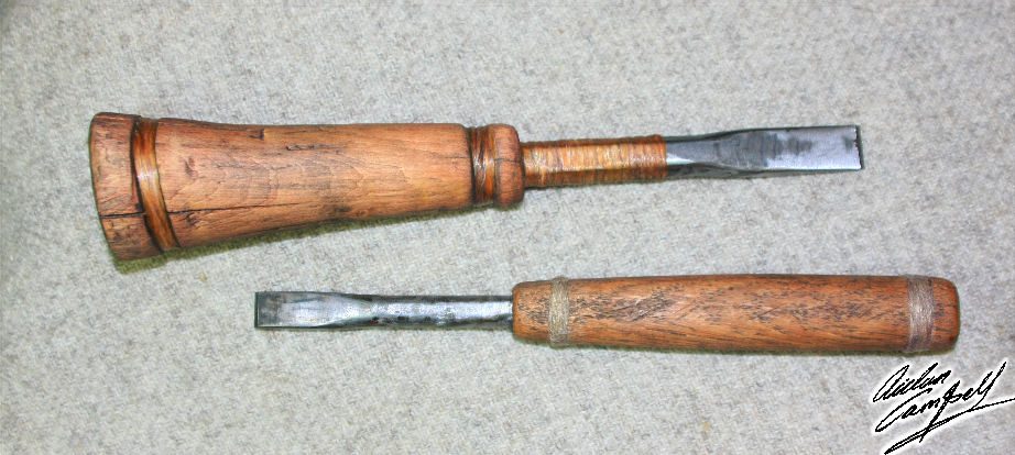 A lot of prop making is driven by changes of plan resulting in tight deadlines to get stuff in front of the camera without holding up a shoot. However, when fully functional 'olde worlde' tools were required for detailed close up film work of a 'pseudo medieval' stone mason at work I'd have preferred a reasonable amount of time to either source genuinely old tools or properly manufacture quality replicas of what was required. In this instance I had to drop everything and improvise quickly to go from initial confirmation of what was wanted, through finding suitable raw materials, to newly made tools and on to antiquing them in little more than three hours. So although fundamentally simple items I was pleased when they both met the director's approval in terms of aesthetics and functioned as well as the mason's modern tools. Size: approx. 300mm long