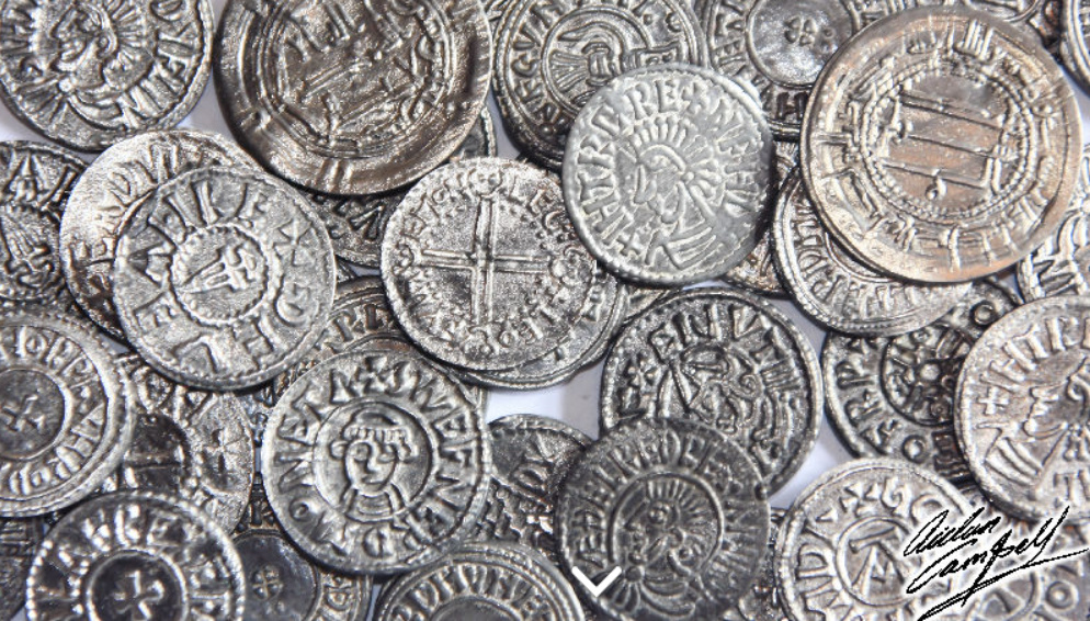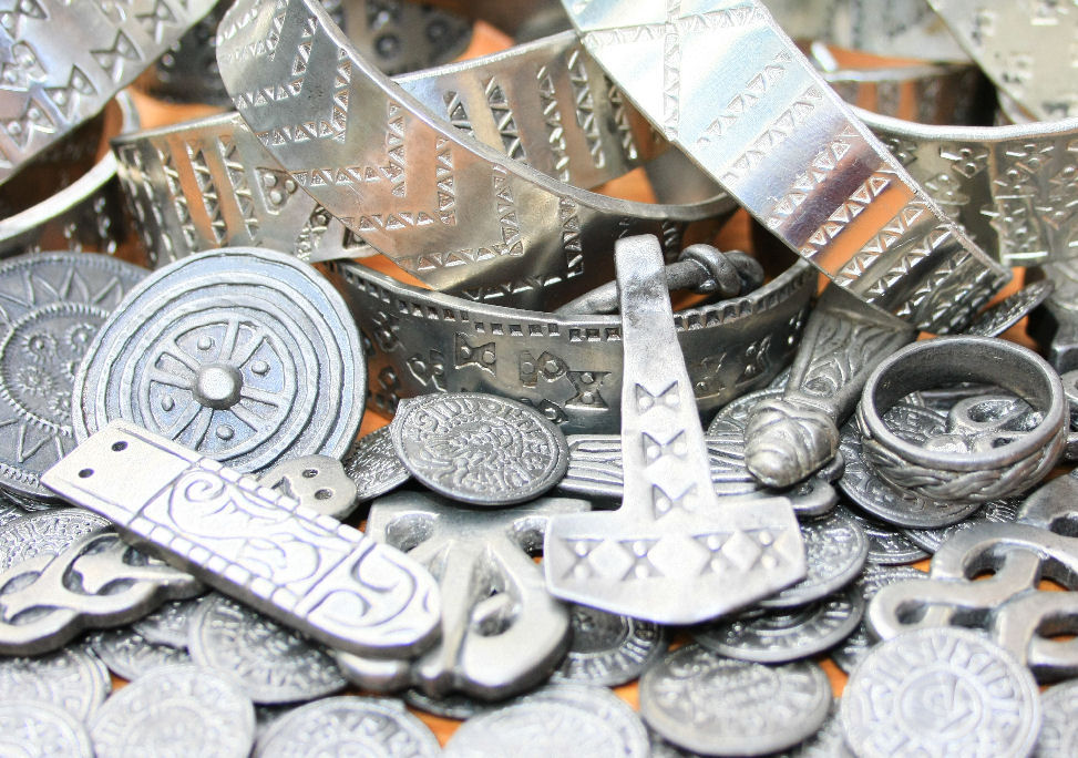 Viking treasure hoard comprised of assorted coins, rings, bracelets brooches and other pieces. Size: varied