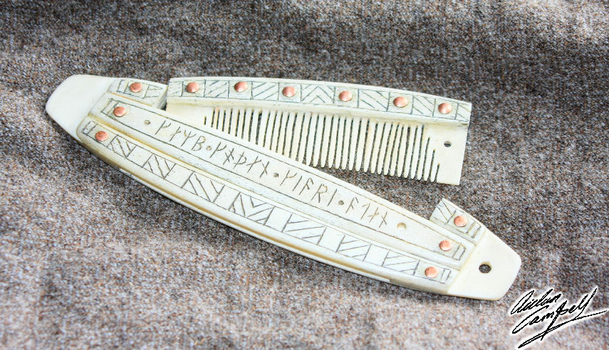 Hand crafted antler and bone comb with case, the runic inscription modified from a famous find to read  'Aidan makes a good comb'. Size: approx. 200mm long