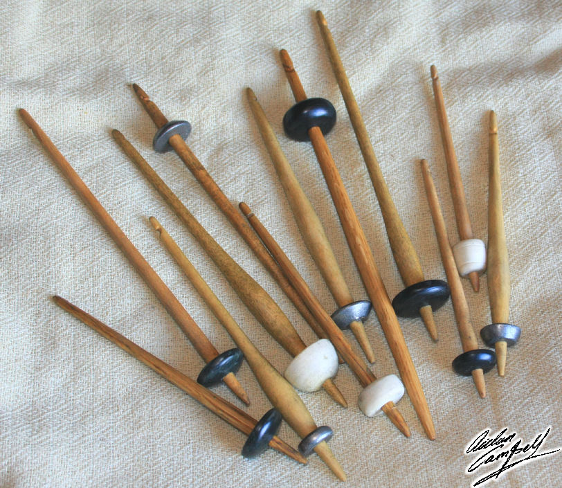 Various styles of replica drop spindles from different periods with whorls made from soapstone, antler and lead alloy. Size: average 200mm long