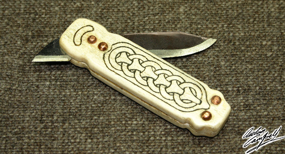 Copy of a double bladed folding bone handled knife. Size: approx. 120mm diameter
