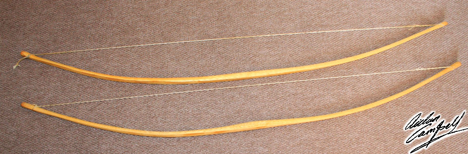Pair of early medieval ash self knocked longbows with hand braided bow strings. Size: approx. 1800mm long