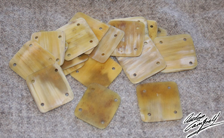 Hand steamed, flattened and polished cattle horn cards for tablet weaving decorative braid. Size: approx. 40mm square