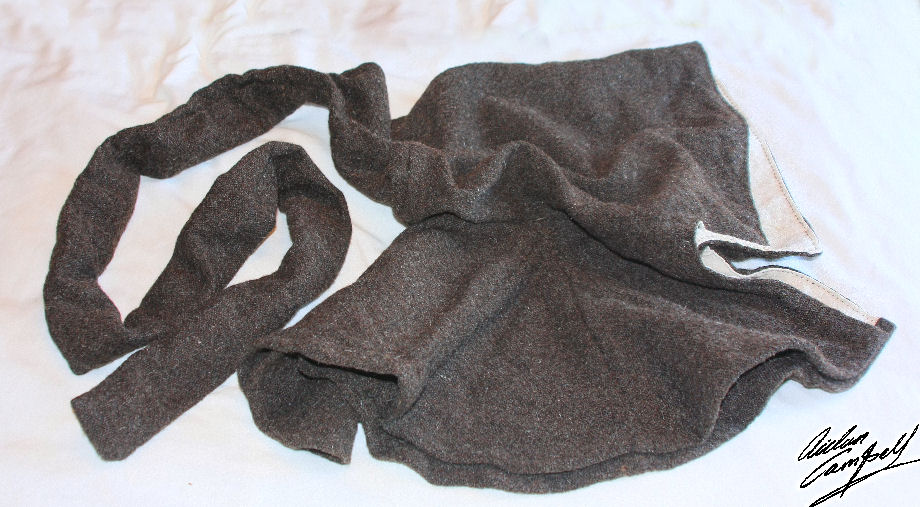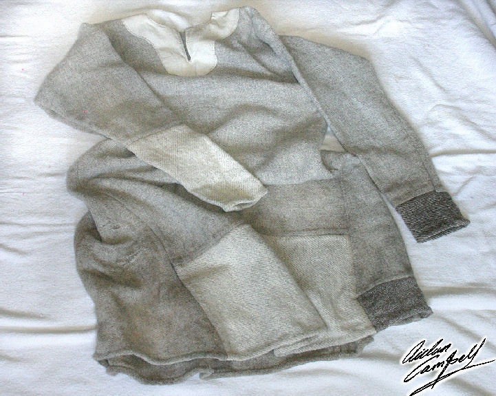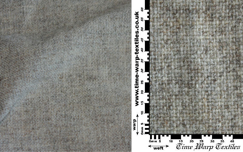 Superficially identical to the previous Z/S 2-2 twill fabric but slightly finer sett and woven using undyed naturally grey kempy fleece  spun to a fractionally higher grist, representative of much low to medium status home spun/woven cloth in the early medieval period