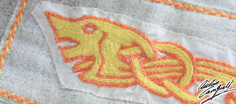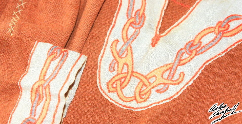 Details from a Viking tunic made in madder dyed fine weave kreuzkoper twill with decoration completed in naturally dyed wool yarns coloured with madder, woad and weld