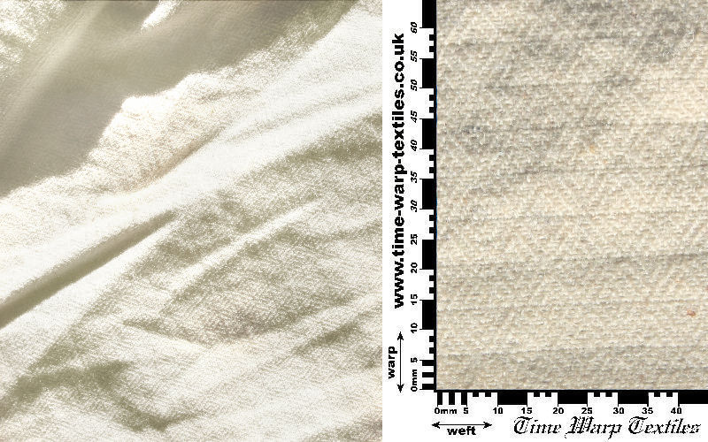 Coarse sett Z/S 2-2 twill in pale undyed natural grey kempy yarn  representative of much low status home spun/woven cloth in the early medieval period
