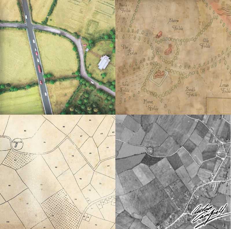 Interactive educational model, faked period maps and aerial photos for teaching about landscape archaeology in a class room. Size: model 1200mm square