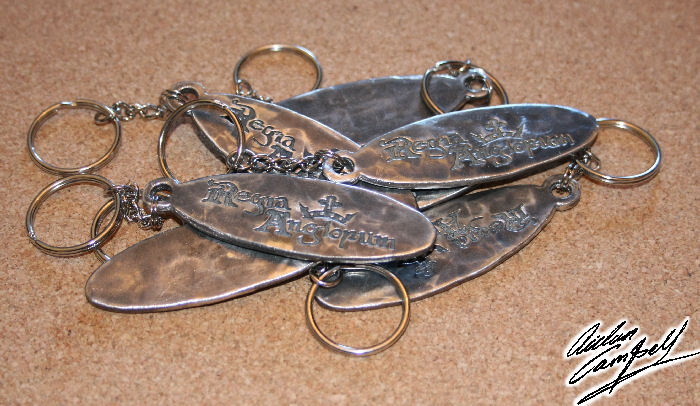 Cast pewter key chains produced as merchandising or corporate giftware. Size: length 80mm
